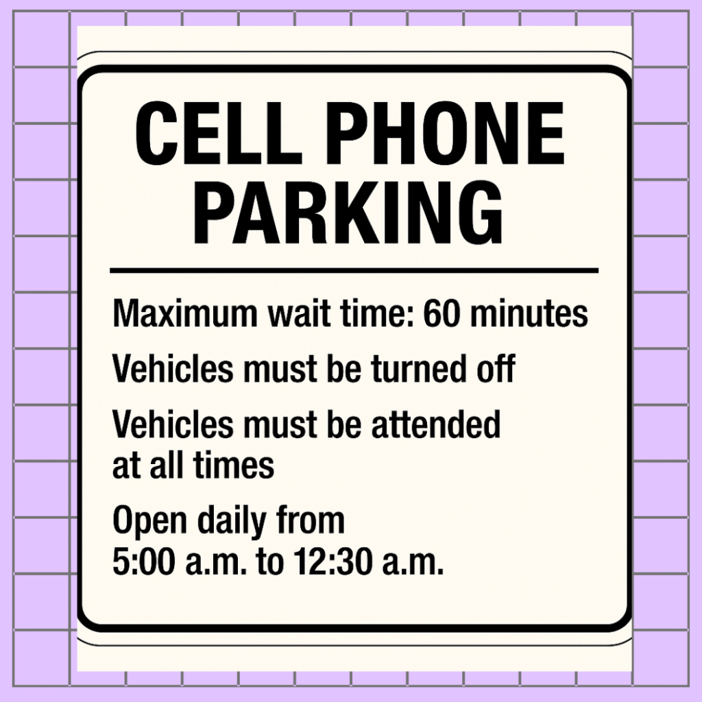 Quick rules recap: stay with your vehicle in the Cell Phone Lot, engine off, respect posted time limits, and approach terminals only when your rider is truly ready.